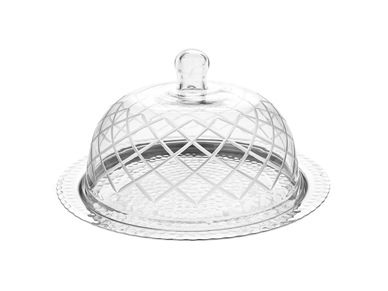 Серебряная металлическая тарелка со стеклянным куполом 28х18см